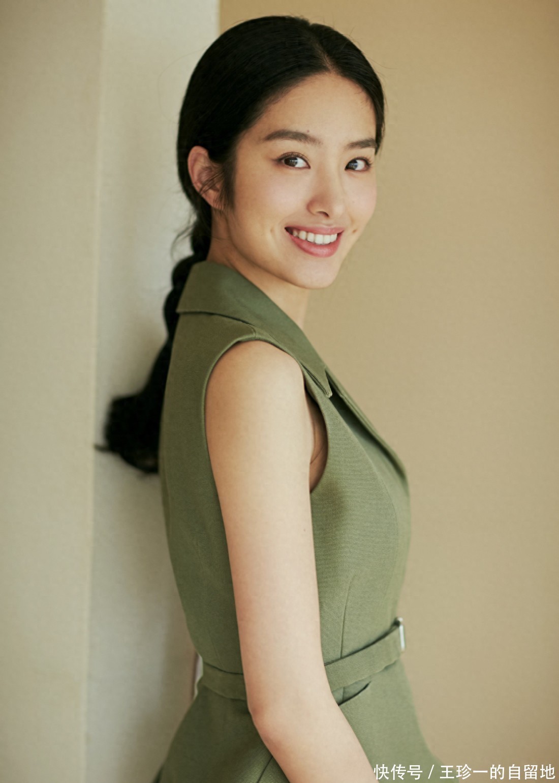 杨采钰上身穿了一件黄色的薄毛衫,下身穿了一件淡绿色的裙子。