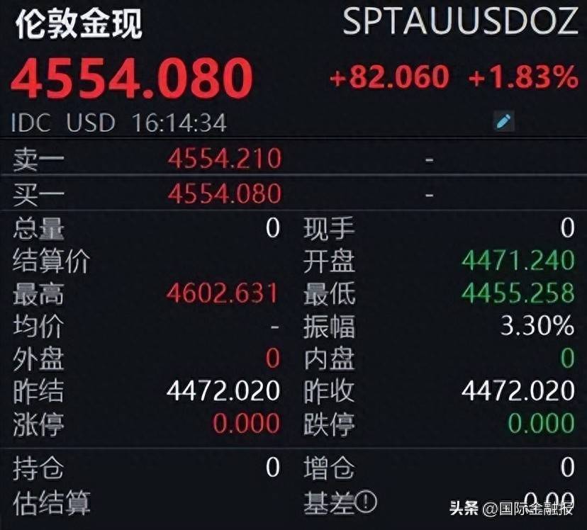 法规记者发稿,伦敦金现报4554.08好意思元/盎司,日内大涨1.83%,盘中最高涉及4602.631好意思元/盎司,最低涉及4455.258好意思元/盎司,多空博弈态势突显。