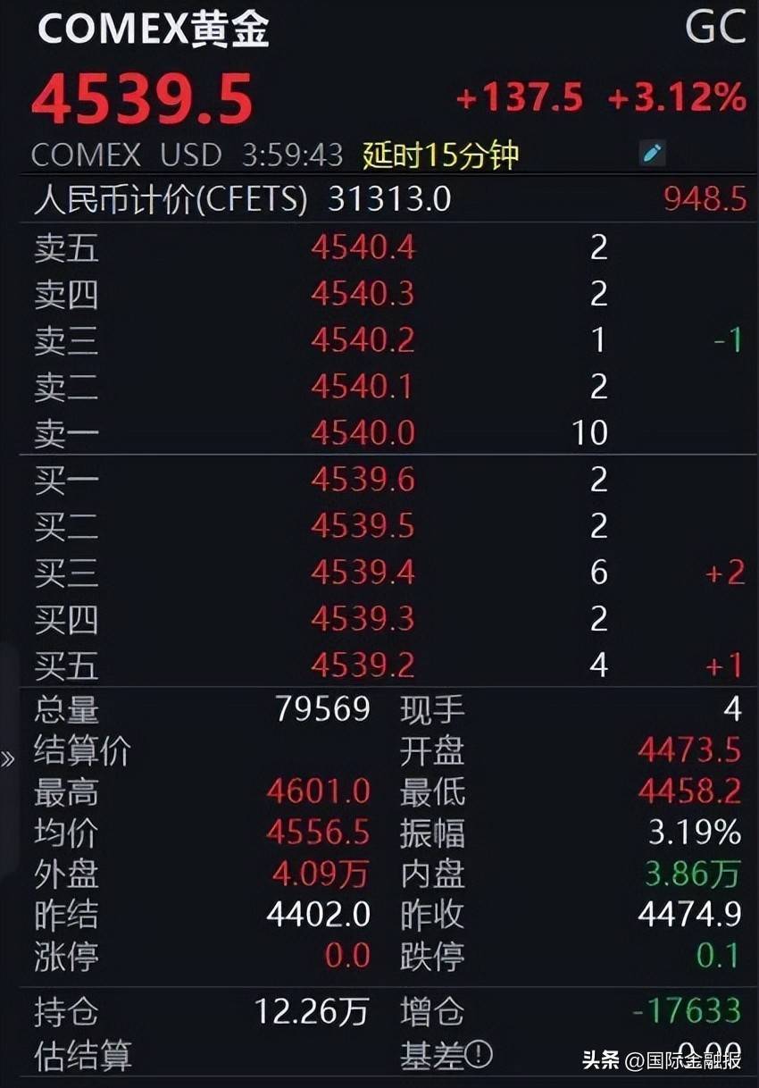 期货阛阓同步走高。法规记者发稿,COMEX黄金期货日内大涨3.12%,报4539.5好意思元/盎司,盘中最高上探至4601好意思元/盎司,最低涉及4458.2好意思元/盎司,与现货阛阓走势保握联动。